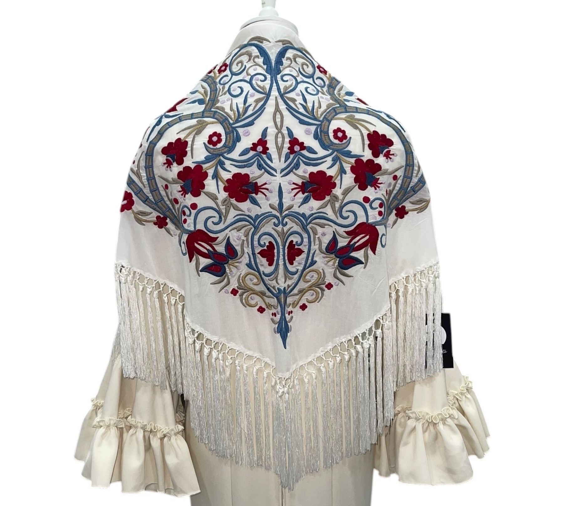 Los flecos, también elaborados en hilo de seda, han sido flecados a mano siguiendo técnicas artesanales que garantizan una terminación impecable, movimiento armonioso y durabilidad superior. Cada hebra ha sido colocada individualmente, reflejando el cuidado y la tradición que caracterizan a los mantones de alta calidad.