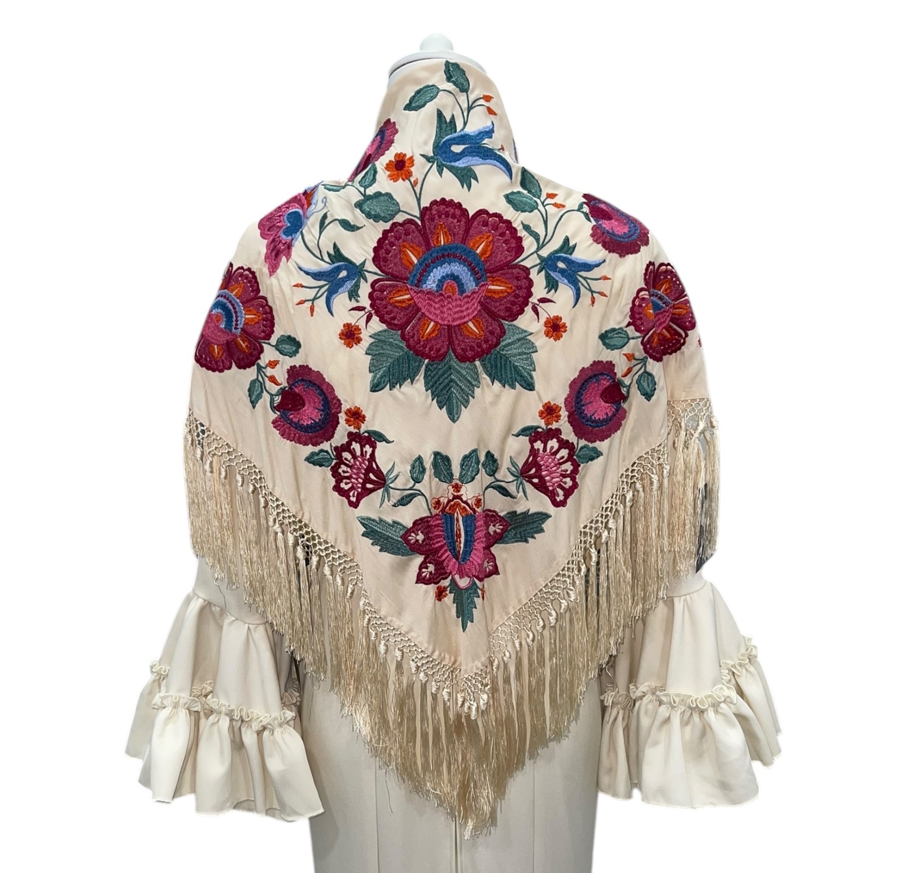 El bordado, realizado con hilo de seda, destaca por su precisión y riqueza visual, creando motivos que evocan tradición y sofisticación. Los flecos, también de seda, han sido flecados a mano mediante técnicas artesanales que garantizan una terminación impecable. Cada hebra ha sido colocada individualmente, logrando un movimiento armonioso y una estética cuidada hasta el último detalle.